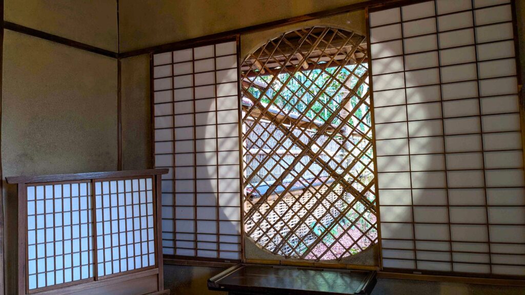 本堂(草庵)に座り、有名な「吉野窓(虹の窓)」を眺めます。
